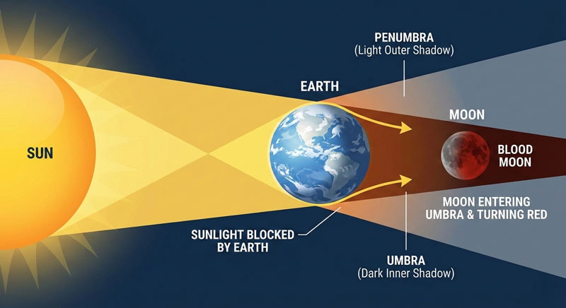 - A “Blood Moon” is caused by sunlight scattering through Earth’s atmosphere, creating a red or copper hue.